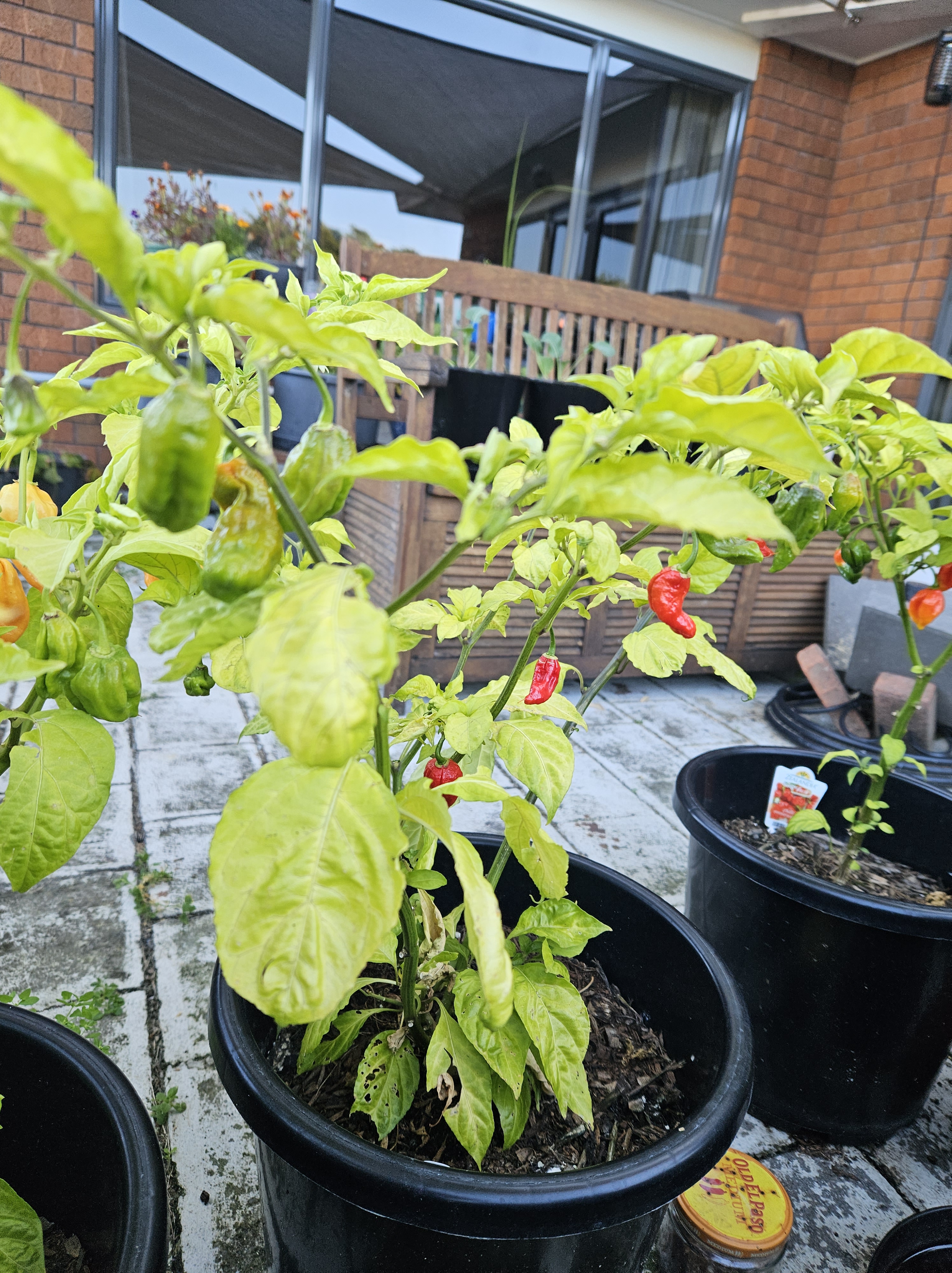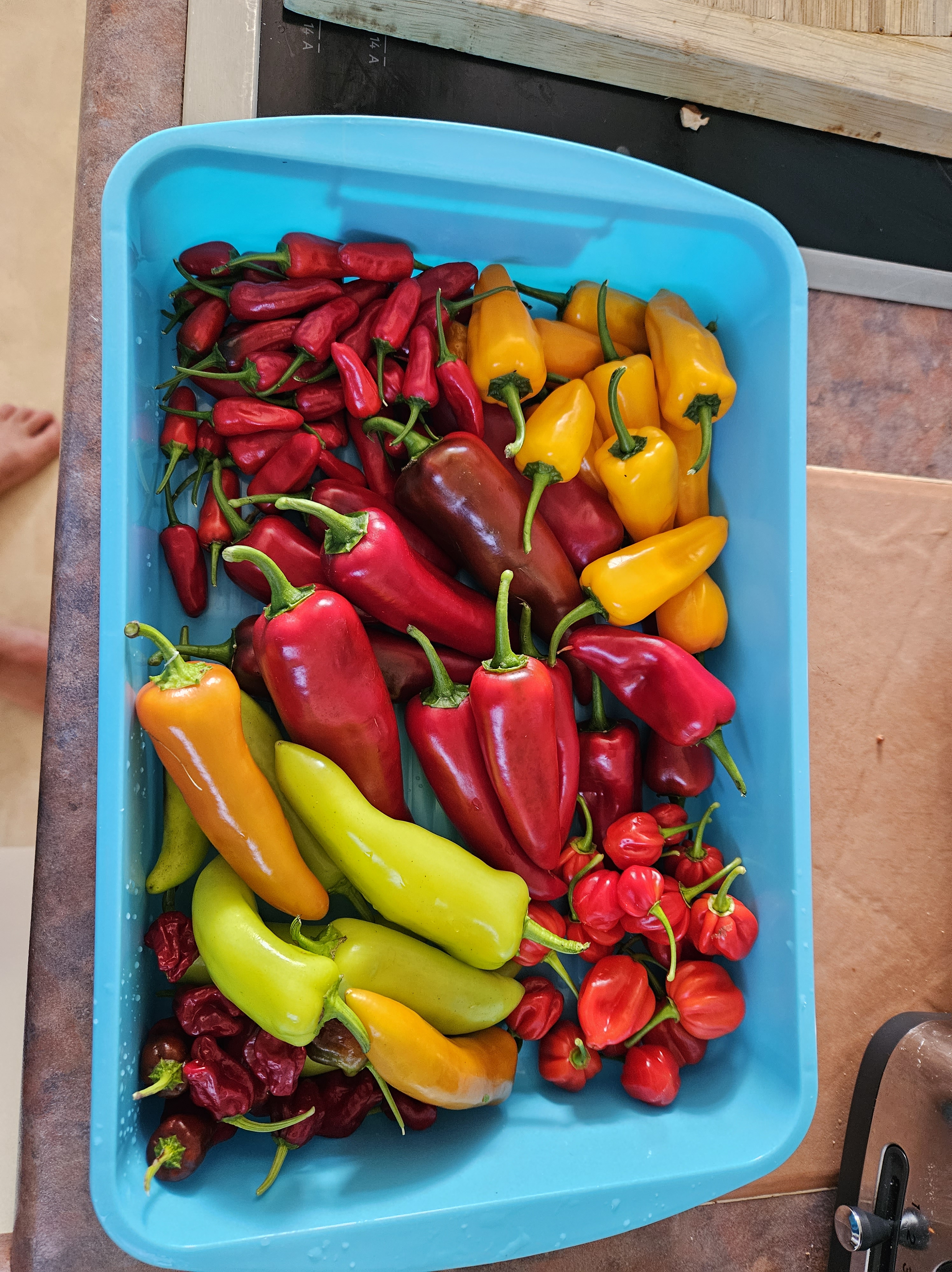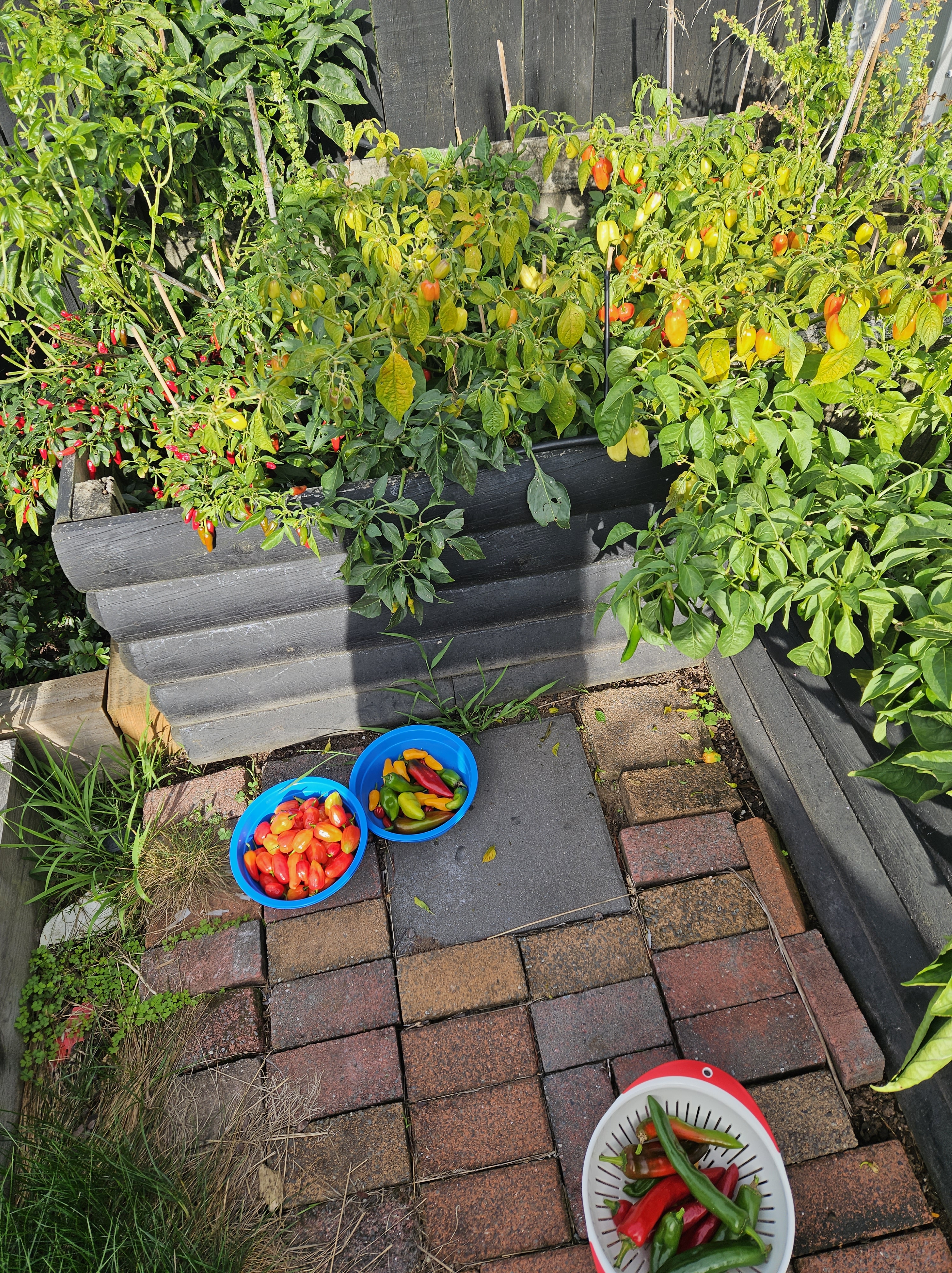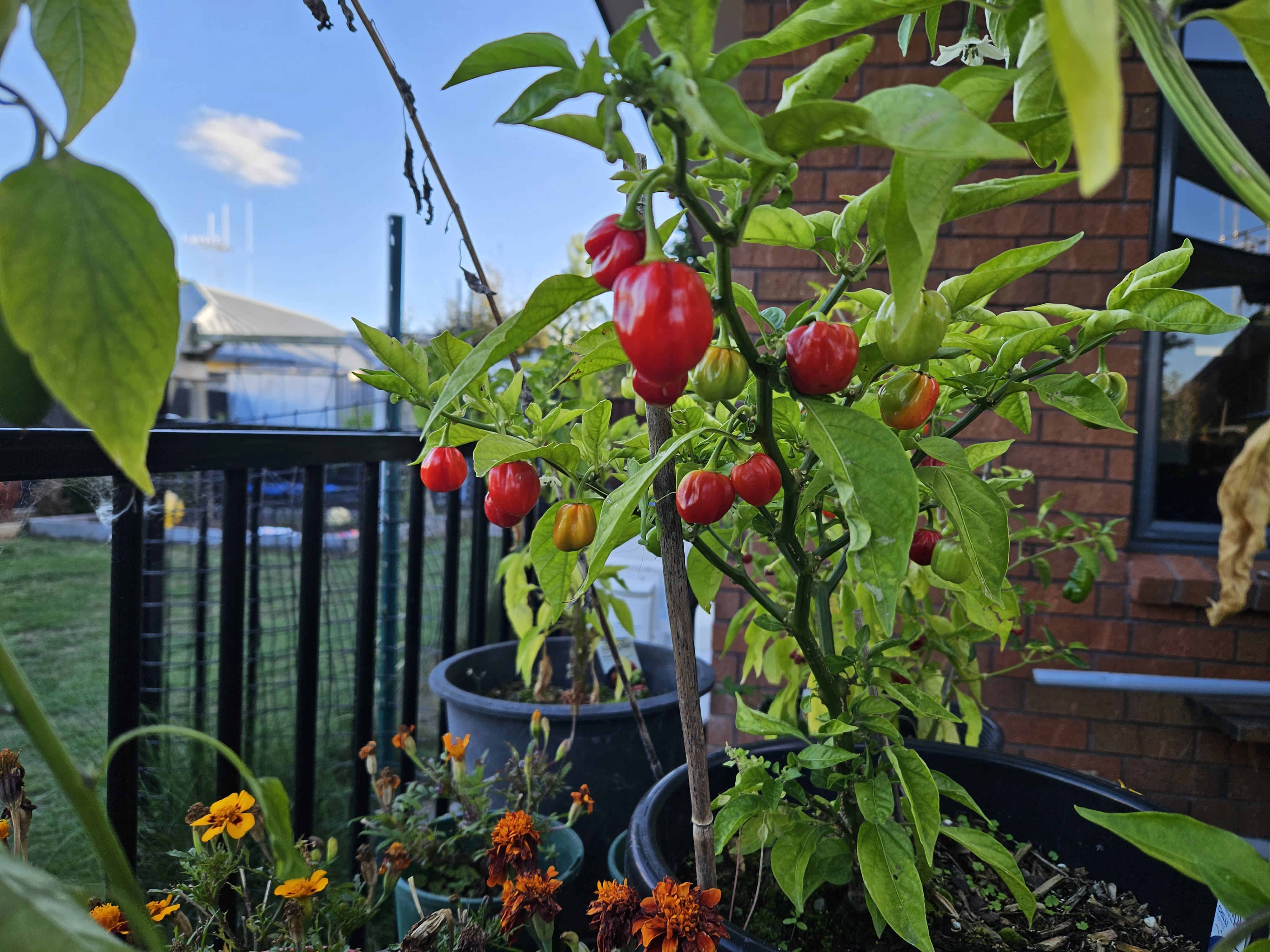 Anaheim, Padron, Apache, Habanero, Serrano, Cheyenne, Hungarian Yellow, Wildfire, Ghost, Trinidad Scorpion, Carolina Reaper, Yellow Wax. I was also supposed to have Jalapeno, but didn’t have much luck, and the Cayenne ended up being capsicums—still a great year. Plenty of marigolds too to keep the pests away from the chillis.